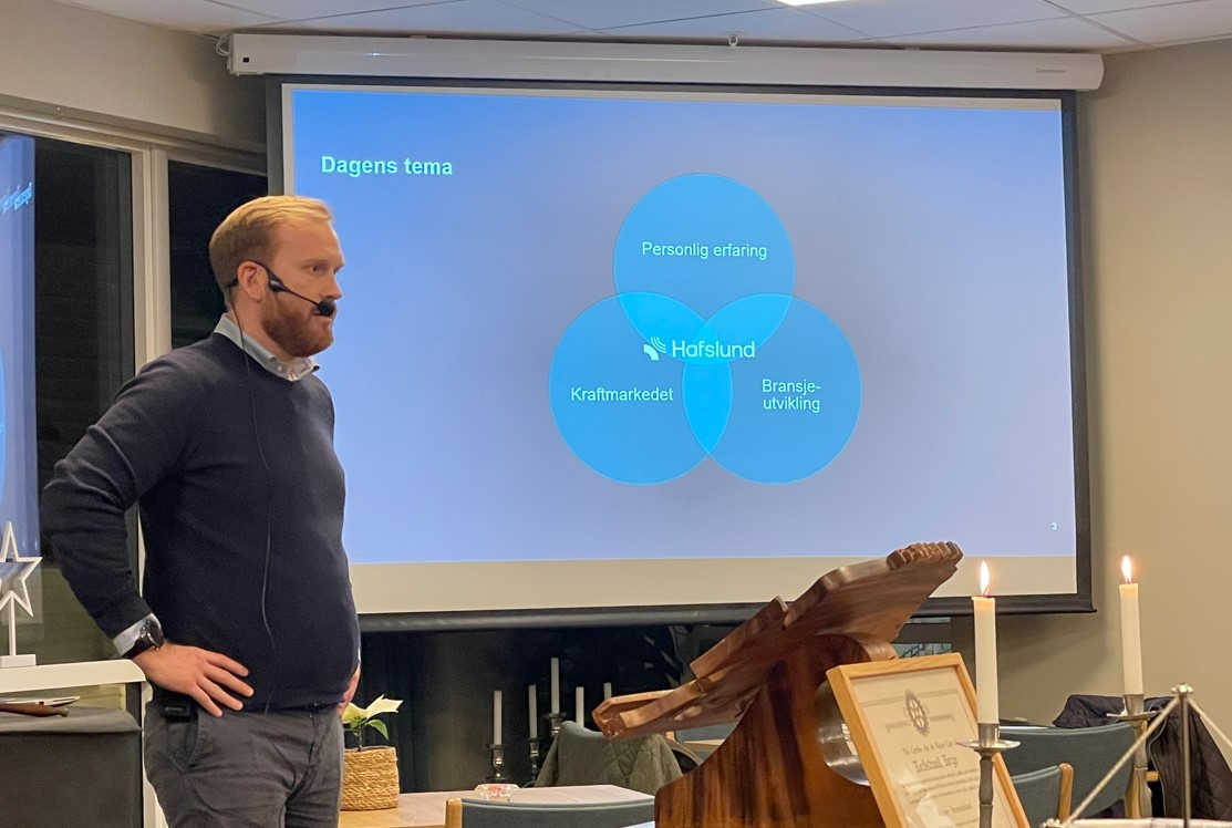 Her fikk vi knyttet nærmere bekjentskap med vårt nye medlem Anders Sangvik Halvorsen. Anders holdt et imponerende innlegg hvor han fikk fortalt om seg selv, samtidig som han holdt et profesjonelt innlegg med tittel "Fra vann til velferd". Her fikk medlemmene en grundig innføring i historien bak selskapet Hafslund. Videre gav han oss en grundig innføring i hvordan energimarked og fastsetting av prisen vi som forbrukere må betale for strømmen.